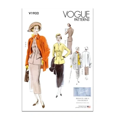 Sewing pattern packet comes with sewing templates, fabric recommendations, pattern pieces, sizing guides, and instructions Sewing pattern template for misses' sizes 8-10-12-14-16 Collarless jacket with faux pockets has long two-piece sleeves. Slim 3-piece skirt has centre-back pleat. Straight three-quarter length coat with two flap pockets and single-button closing has wide turn-down collar, straight sleeves, and back vent Vogue sewing patterns are comfortable, confident, and modern; perfect for staying on top of today's fashion trends Vogue pattern sewing templates are proudly designed and printed in the USA