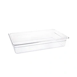325(H) x 530(W) x 100(D)mm. Polycarbonate. Clear. Highly durable polycarbonate remains cool to the touch for efficient handling. Dishwasher safe for easy cleaning. Temperature range -40 to +100°C. Transparent for easy identification of contents.