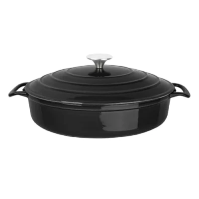 65(H) x 280(Ø)mm. Cast Iron. Black. Self-basting design keeps food moist while cooking. High quality cast iron construction for supreme heat conduction and retention. Strong integral handles for easy positioning.