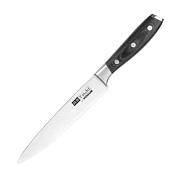 329(L)mm . 13(L)". Japanese VG-10 stainless steel core with double-layer Damascus steel coating. Black. Remarkably sharp knife, featuring many layers of stainless steel. Attractive and comfortable Micarta handle. Handwashing recommended.