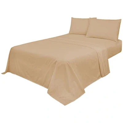 Voice7 Non Iron Latte 4pc Sheets Set (Fitted Sheet + Flat Pillow Cases Pair) Percale Super Poly Cotton Bedding Sets (Latte, Double)