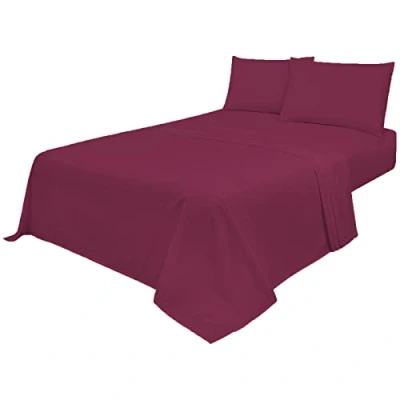 Voice7 Non Iron Wine 4pc Sheets Set (Fitted Sheet + Flat Pillow Cases Pair) Percale Super Poly Cotton Bedding Sets (Wine, king)