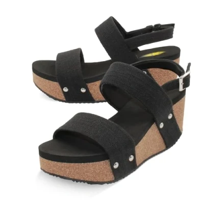 Metal buckle ankle closure and accent clog studs Signature Volatile Ultra comfortable EVA insole Patterns including linen and faux snake Super soft liner for comfort Mid cork wedge 2.75" heel height