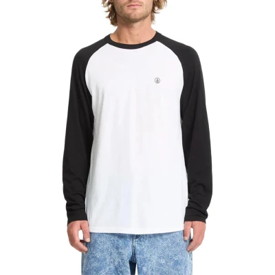 * The Volcom Pen L/S tee has a typical long-sleeved t-shirt build, finished with details on the chest * Raglan construction with a white body and black sleeves and subtle black black details * Elasticated and ribbed neckline * Slight scooped hem * Materials: 70% Cotton / 30% Recycled Cotton * Fit: Classic raglan fit