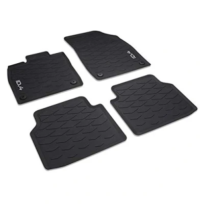Original VW ID.4 premium all-weather floor mats, 4-piece complete set for the front and rear footwell 100% perfect fit as Volkswagen original accessories With integrated press stud attachment points on the front floor mats, odourless, non-slip, washable, robust and durable. Features: light weight (special material composition). Design: with ID.4 model lettering on the front floor mats. Colour: titanium black Box contents: 1 set = 4 x floor mats (2 x front, 2 x rear) Suitable for VW ID.4 from 2021