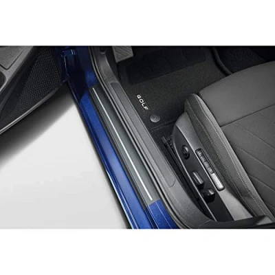 Original VW Golf 8 (5H) protective film for door sill. 100% perfect fit as original Volkswagen accessory. Colour: black with silver stripes. Box contents: 1 set = 4 pieces (2 x front, 2 x rear). Suitable for VW Golf 8 (5H), from 2020.