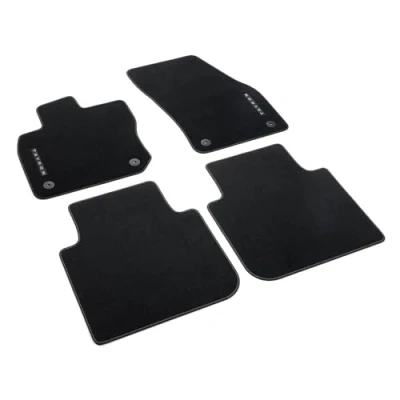 ORIGINAL MATS: A set of 4 original Volkswagen Tayron Premium Velours floor mats made from high-quality 700g/m² velour. PERFECT FIT: The mats are 100% tailor-made for the Tayron model (from 2025), providing perfect floor covering coverage. MOUNTING SYSTEM: Equipped with a two-point mounting system with round snaps, preventing the mats from slipping. EXCLUSIVE DESIGN: Front mats decorated with elegant TAYRON lettering, finished with black piping. COMPLETE SET: Includes 4 mats (2 front and 2 rear) in black, made of velour with non-slip backing.