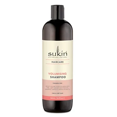 Australian made, natural, Cruelty free, Vegan & carbon neutral Free from: sulphates, parabens, Synthetic fragrances, Animal derivatives, harsh detergents, Propylene Glycol, artificial colours, triethanolamine & mineral oils Key ingredients: rice Protein, pineapple, mango, Papaya Application: wet hair and massage Sukin volumising Shampoo into the scalp to form a gentle lather. Rinse thoroughly. Suitable for fine and limp hair
