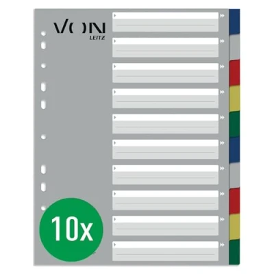 Von Leitz binder dividers: 10 x index dividers each with 10 extra wide A4 folder dividers, polypropylene, in different colours, ideal for a better overview when storing important documents Index cards with tabs: printed card front with plenty of space for writing; thanks to the A4 maxi format, the dividers can also be used with poly pockets Universal punched (11-hole): compatible with file folders and ring binders, for flexible storage of documents, ideal for sorting by category IDEAL FOR OFFICE, SCHOOL OR HOME - Premium quality dividers with durable polypropylene tabs and personalised front Box contents: 10 x von von von Leitz 12270000 A4 dividers with 10 index sheets, extra wide folder dividers, plastic/cardboard, multicoloured,