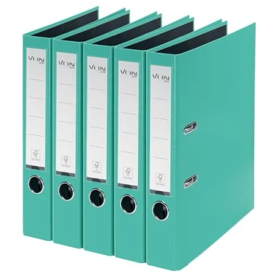High-quality von Leitz A4 lever arch file with plastic cover: 5 x folders with 2 ring mechanisms, ideal for organising and storing papers and projects at home; 50 mm spine width for up to 350 A4 sheets (80 g/m²) Flexible storage: back label pocket for easy identification; PP coated FSC certified cardboard, ideal for colour sorting work, documents or invoices WIPE CLEAN PP COVER: A choice of colourful colours to protect your papers, strong and durable with a plastic coated protective layer for travel and large capacity FOR OFFICE, SCHOOL OR HOME: Binder with finger hole, Rado rings and metal edge protection for a secure file folder; Sturdy mechanism inside for hassle-free document storage Box contents: 5 x VON 2-ring A4 folders, cardboard with plastic cover, narrow lever folder, 50 mm spine width, mint green, 10561051