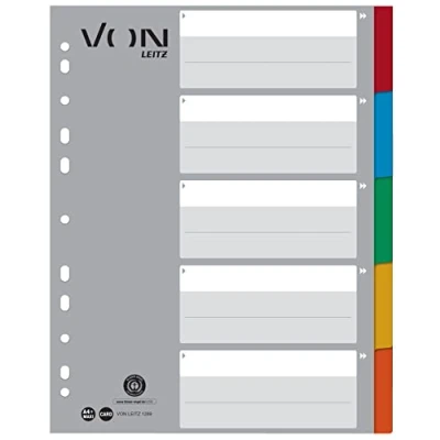 Von Leitz folder dividers: 10 x index with 5 extra wide A4 file dividers with polypropylene plastic tabs in different colours, ideal for a better overview when filing Index cards with tabs: customisable printed cardboard front with ample space for labelling and personal details, the dividers fit almost any lever arch file Universal punched holes (11 hole): compatible with file folders and ring binders, for flexible storage of documents; ideal for sorting by categories ENVIRONMENTAL FIELING - Made from 100% recycled cardboard, perfect for office and home use, with high quality PP dividers Box contents: 10 x Von index A4 with 5 index sheets, extra wide file dividers, plastic/cardboard, blank, multi-coloured, by Leitz, 1289000