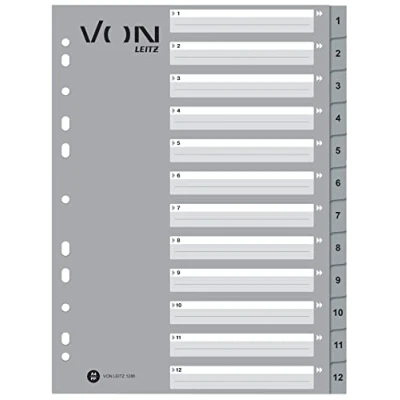 Von Leitz binder dividers: 10 x number dividers extra wide grey A4 folder dividers with numbered plastic tabs 1-12; ideal for a better overview when storing important documents Index cards with numeric tabs: customisable front made of printed cardboard with plenty of space for labelling Universal punched (11-hole): compatible with loose-leaf binders and ring binders; ideal for separating by subject, year, or monthly bills IDEAL FOR OFFICE, SCHOOL OR HOME - Premium quality dividers with durable polypropylene tabs and personalised front Box contents: 10 x VON number index A4, 1-12 numbered folder dividers, plastic/cardboard, by Leitz, grey, 12860085