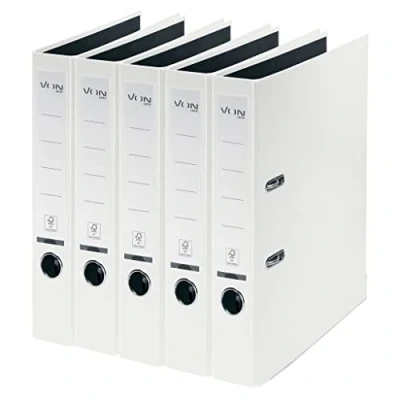 Von Leitz A4 Lever Arch File with Plastic Binding: Folder with 2 ring mechanism, ideal for organising and storing papers and projects at home; 50 mm spine width for up to 350 A4 sheets (80 g/m²); Pack of 5 The flexible storage solution: the slip pocket on the back provides an optimal overview and the PP coated and FSC certified cardboard is ideal for colour coding WIPE CLEAN SURFACE - The folder features bright colors, which is strong, durable and long lasting, and keeps your documents safe thanks to its plastic coating Ideal for office, school or home: high quality folder with finger hole, rado rings and metal fittings for permanent filing of documents Box contents: 5 x Von A4 folders with 2 rings, cardboard with plastic coating, 50 mm wide for 350 sheets, available in a selection of bright colours with modern VON design, white, 10561001