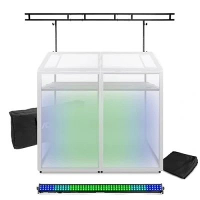 Complete Mobile DJ Booth Kit – This portable DJ booth includes a foldable DJ stand, light bridge, and LED strip light, creating a professional setup for events, clubs, weddings, and performances. Sturdy & Portable DJ Stand – The DJ booth features a durable, lightweight frame with quick assembly, making it easy to transport. Ideal for mobile DJs needing a professional yet compact setup. Customizable Black & White Lycra Covers – This mobile DJ booth comes with interchangeable lycra covers, concealing cables while providing a sleek, adaptable look to match different event styles. Heavy-Duty Light Bridge with 10 Fixture Points – The DJ stand includes a sturdy light bridge with multiple mounting points, allowing DJs to create dynamic lighting effects for an engaging performance space. LED Strip Light for Instant Effects – The included LED strip provides vibrant lighting with built-in effects and standalone operation, eliminating the need for additional controllers in your DJ booth setup.