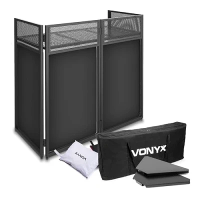 Versatile mobile DJ booth system with a foldable perforated DJ desk and sturdy corner shelves, creating maximum workspace, ideal for professional DJs performing at parties, weddings or clubs. Comes with interchangeable black and white flame-retardant lycra covers, adaptable to any event setting, providing sleek aesthetics while allowing creative lighting effects when backlit. Fast, efficient setup thanks to compact and collapsible lightweight construction; easily transported between gigs, with heavy-duty carry bags protecting both DJ booth and detachable shelves. Metal corner shelves expand available space, keeping laptops, mixers and lighting gear neatly organised and within easy reach, streamlining equipment access during dynamic live sets. Premium components and durable metal framework ensure strength, stability and reliability under professional usage, comfortably supporting equipment weights up to 25kg for confident performances.