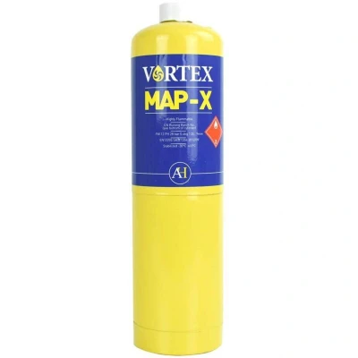 General description The Arctic Hayes Vortex Map-X is a high-temperature brazing gas designed to burn hotter than traditional propane and butane gases. It is suitable for all soldering and brazing applications, providing efficient and reliable performance. The gas is compatible with most CGA600 threaded torches and is sold in a 400g non-refillable canister, making it ideal for professional and DIY use where high heat is required. Technical specifications Burns up to 10% hotter than other Map-style gases Canister capacity: 400g Designed for use with CGA600 threaded torches Compatibility and accessories Compatible with most CGA600 threaded brazing torches Installation Attach the canister securely to the compatible torch following the manufacturer's instructions Ensure the connection is tight to prevent leaks before igniting Usage Use in high-temperature soldering and brazing tasks Ensure proper ventilation during use Handle with care due to high heat output and pressurized gas Other