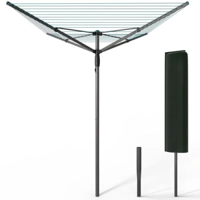 LARGE CAPACITY – With 45 metres of drying line, this rotary clothes dryer provides ample space to dry a full family load of laundry at once. Each arm is fitted with 12 lines, perfect for hanging bed sheets, towels, clothes, duvets, and pillows. The foldable umbrella design makes drying both practical and efficient. ROTARY & ADJUSTABLE – Featuring 4 rotating arms, the washing line spins smoothly for easy loading and faster drying. The dryer can be adjusted to 4 different height levels, allowing you to customise the overall height and line tension to accommodate heavier or longer laundry. STURDY & DURABLE – Designed for long-lasting use, the outdoor clothes airer is fixed firmly in place with a metal ground spike for excellent stability. Its robust metal pole is resistant to rust and bending, while the UV-resistant PVC coated lines maintain their strength and tension over time. PROTECTIVE COVER INCLUDED – Comes with a waterproof and durable PE cover to protect the rotary airer when not in use. The cover shields the frame and lines from rain, dust, and moisture, extending the life of your dryer and keeping it clean and ready to use. EASY TO INSTALL – Quick and simple to set up with no special skills required. Just secure the pole into the ground spike and unfold the arms to start drying immediately.