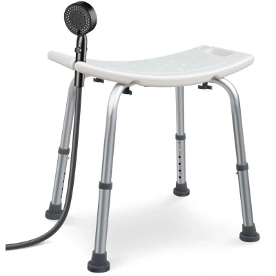 ADJUSTABLE HEIGHT-This shower stool offers 6 adjustable height levels, ranging from 38 to 52 cm, allowing it to fit comfortably for users of all body types. It’s especially suitable for the elderly, pregnant women, or anyone needing a secure and adjustable shower seat. STRONG AND STURDY DESIGN-Built with a durable aluminium frame, this stool provides excellent stability, even with regular use. Its anti-corrosion coating makes it ideal for humid environments like bathrooms or wet rooms. It supports up to 136 kg, ensuring safe and reliable use every day. COMFORTABLE & FUNCTIONAL SEAT-The ergonomic HDPE seat is gently curved to follow the natural shape of the body, offering both stability and comfort while sitting. Its perforated surface allows water to drain quickly, preventing pooling and keeping the seat dry and hygienic even during longer showers. SAFETY & PRACTICAL FEATURES-Equipped with non-slip rubber feet, this shower chair ensures stability on wet floors and reduces the risk of slipping. It also includes two integrated shower head holders on each side of the seat, allowing hands-free use for greater comfort and independence. LIGHTWEIGHT & EASY TO ASSEMBLE-Designed for practicality, the stool features built-in side handles to assist sitting and standing. Lightweight and easy to move, it can be stored effortlessly even in small spaces. Assembly takes just a few minutes, without the need for tools — perfect for home use, care facilities, or travel.