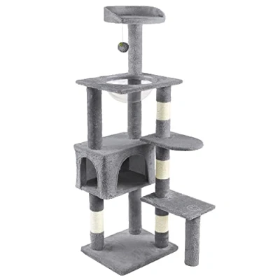 Our cat tree expands the usable area vertically and offers more space for pets to climb and explore. Top perch offer maximum comfort and relaxation for feline friend to sit on and look out the window, they can jump up and down, watch birds, or explore around in their castle. The cat tower has everything to entertain your kitten, 1 fluffy condo offers super soft and warm lounging spots, 1 hair ball react to kittens’ move intensively and draw their attention, 1 observation and jumping platforms, and transparent space capsule designed to fit cat's curve. All the multi-layer tower meets the climbing nature of kittens. The cat tree has a solid construction and better stability. An extra strip is provided to attach the cat tree to the wall as the prevention of tipping over The cat activity tree comes with all necessary parts and hardware, it is very easy to assemble under the detailed instructions. Vounot Cat Tree Size:L.52 x l.43 x h.138cm (L20 x W17 x H54 INCHES)