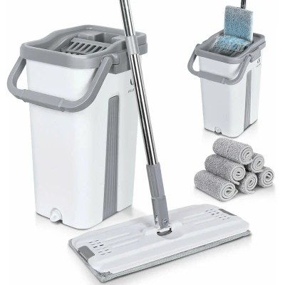 VOUNOT Flat Mop and Bucket set, 2 in 1 Hands Free Squeeze User Friendly Design, Includes 6 Reusable Microfiber Pads, White