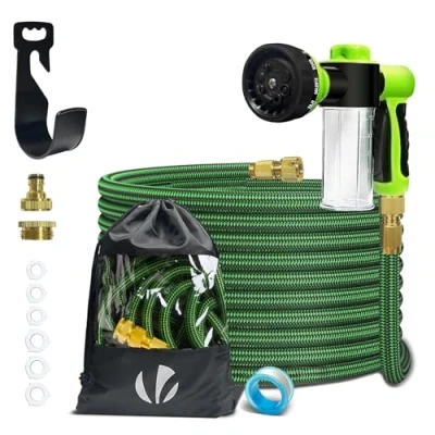 EXPANDABLE: When in use, it expands to three times its length and extends to 15m, shrinking to the original length when not in use. The garden hose will not tangle, twist or kink ROBUST AND DURABLE The flexible water hose uses a high-density latex core and a powerful polyester fabric cover to prevent breakage and leakage. It can have a water pressure of 10 bar. Garden hoses are for long-term use Comprehensive box contents: flexible hose comes with high-quality 1/2 inch and 3/4 inch brass fittings, to fit all taps according to European standards, but also 6 rubber rings and a sealing tape to prevent all types of leaks. But the set also includes a storage bag and a wall mount for space-saving and easy storage MULTI-FUNCTION NOZZLE 8 stage multi-function nozzle and detergent container with dial, the semi-automatic fixing device on the handle can spray water for a long time without hand pressure. The hose nozzle can be freely switched between water and foam. It has 3 levels of foam flow and stepless water flow control Multi-purpose hose: expandable length and proper water flow to support multiple purposes to meet all your watering and cleaning requirements and cleaning applications: garden, floors, lawn, pets, pool, car wash and so on., Weight: 2.645547144 Pounds, Manufacturer: VOUNOT