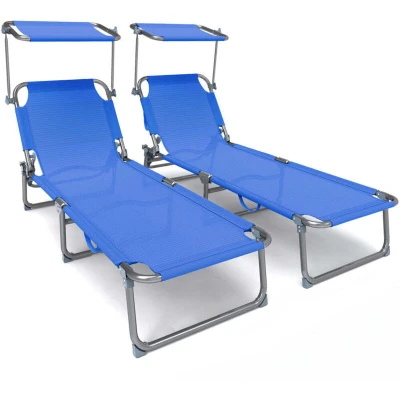 General description The VOUNOT Textilene Folding Sun Loungers Set includes two comfortable loungers designed for relaxation by the pool, beach, or garden. Each lounger features an adjustable backrest and sunshade, allowing you to enjoy the sun while protecting yourself from glare. The loungers are easy to carry and stable on various surfaces, making them perfect for outdoor use. Technical specifications Available Color: Grey/Blue/Beige/Blue Folded dimension: 73 x 58 x 15 cm Chair dimension: 190 x 58 x 27 cm Weight (per chair): approximately 6.0 kg Material: Textilene fabric and metal frame Manufacturer's Suggested Maximum Weight: 110 kg Installation No assembly is required; the loungers are ready to use right out of the box. Usage The loungers can be used in various settings, including: By the pool At the beach On the terrace In the garden Other information Images of the product: