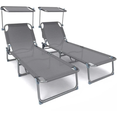 VOUNOT Folding Sun Loungers Set of 2, Textilene Reclining Sunbed with Adjustable Backrest & Sunshade for Garden, Beach, Patio, Pool, Camp, Load 110 kg, Grey