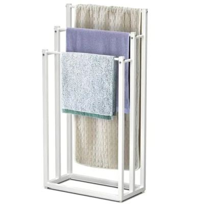ManoManoADVANTAGES Sturdy and stable structure Space-saving design 3-tier construction Easy installation with no drilling required DESCRIPTION SOLID AND STABLE STRUCTURE: Made of sturdy metal with a rust-proof coating, this towel rack offers good durability. Its base is equipped with 4 non-slip pads that ensure perfect stability, even on smooth surfaces like tiles, while protecting your floor from scratches. SPACE SAVING: Whether your bathroom is spacious or more compact, this towel rack optimizes available space. Its vertical design minimizes floor space and fits easily next to the shower, bathtub, or sink, providing a more functional layout and a cleaner, more organized space. 3-TIER DESIGN: With its 3 different heights, this towel rack promotes good air circulation, speeding up drying time. It allows you to easily hang towels, bathrobes, bath mats, and other everyday items. Lightweight and freestanding, it moves effortlessly and fits perfectly in a bathroom, bedroom, or laundry room. EASY