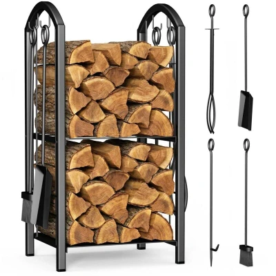 General description The VOUNOT Firewood Log Rack is a stylish and functional solution for storing firewood indoors. This log rack comes with a complete set of 4 fireplace tools, including a shovel, broom, poker, and tongs, making it the perfect addition to your fireplace setup. Its 2-tier design maximizes storage capacity, allowing you to keep enough logs on hand for a cozy evening by the fire. Technical specifications Overall dimensions: 38 x 33 x 75 cm Material: Black powder-coated metal Woodshed size: 75 x 33 x 38 cm Compatibility and accessories Includes 4 fireplace tools: shovel, broom, poker, and tongs 4 side hooks for hanging tools Installation Easy to assemble Usage Designed to keep firewood organized and easily accessible Allows airflow to keep wood dry, even in winter Other information
