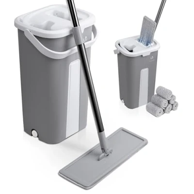 VOUNOT Mop Set with Bucket, Floor for Wring Function, Flat Microfibre & Cleaning Stainless Steel Handle, 6 Reusable Replacement Covers, All Types of Floors, Grey