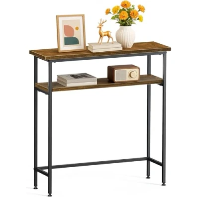 VOUNOT Narrow Console Table, 2 Tier Metal Frame Entryway Table 80x24x80cm, Brown