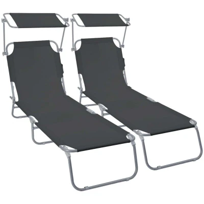 VOUNOT® Set of 2 Folding Sun Lounger with Adjustable Backrest & Sunshade, 4 Position Reclining Bed, Portable Outdoor Garden Chair, Max Load 120kg, Black