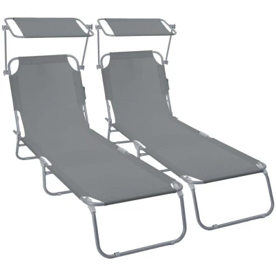 VOUNOT® Set of 2 Folding Sun Lounger with Adjustable Backrest & Sunshade, 4 Position Reclining Bed, Portable Outdoor Garden Chair, Max Load 120kg, Grey