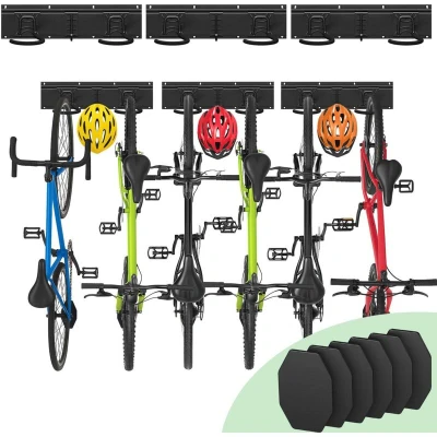 ADVANTAGES Sturdy wall mount Holds 6 bikes + 3 helmets 6 stain-resistant silicone pads Wide compatibility DESCRIPTION FEATURES Dimensions : L.123 x I. 17.5 x H.10 cm Weight : 3kg Color : Black Maximum load: 225 kg Mounting type: Wall mount Materials: Metal, Rubber coating, Silicone Includes: 3 rails, 9 hooks, 6 protective pads, screws and wall plugs, 1 instruction manual WHY CHOOSE OUR WALL-MOUNTED BIKE AND HELMET RACK? HEAVY-DUTY WALL MOUNT: Made from strong metal with a rust-resistant coating, this 3-piece wall rack provides excellent stability and supports up to 150 kg. The two rails (41 × 10 cm each) feature a detachable design that is easy to assemble or take apart, offering flexible installation to suit your space. HOLDS 6 BIKES + 3 HELMETS: Equipped with 4 large reinforced hooks with a widened rubber coating, the rack securely holds up to 6 bikes without scratches or slipping. It also includes 3 smaller hooks for neatly storing helmets. All hooks can be moved and adjusted to