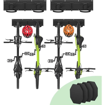 ADVANTAGES Sturdy wall mount Holds 4 bikes + 2 helmets 4 stain-resistant silicone pads Wide compatibility DESCRIPTION FEATURES Dimensions : L.82 x I. 17.5 x H.10 cm Weight : 2kg Color : Black Maximum load: 150 kg Mounting type: Wall mount Materials: Metal, Rubber coating, Silicone Includes: 2 rails, 6 hooks, 4 protective pads, screws and wall plugs, 1 instruction manual WHY CHOOSE OUR WALL-MOUNTED BIKE AND HELMET RACK? HEAVY-DUTY WALL MOUNT: Made from strong metal with a rust-resistant coating, this 2-piece wall rack provides excellent stability and supports up to 150 kg. The two rails (41 × 10 cm each) feature a detachable design that is easy to assemble or take apart, offering flexible installation to suit your space. HOLDS 4 BIKES + 2 HELMETS: Equipped with 4 large reinforced hooks with a widened rubber coating, the rack securely holds up to 6 bikes without scratches or slipping. It also includes 2 smaller hooks for neatly storing helmets. All hooks can be moved and adjusted to