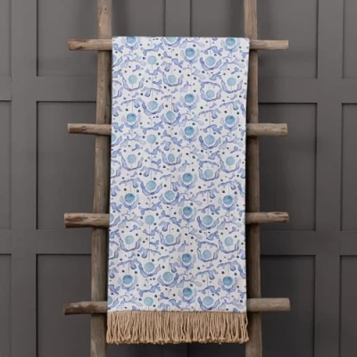 COASTAL-INSPIRED DESIGN: Evoking sun-drenched shores and seaside serenity, the Mariani throw showcases a vibrant print in timeless Grecian blue tones. BRITISH CRAFTSMANSHIP: Proudly designed and printed in-house in the UK, this luxurious piece reflects our passion for painterly artistry and fine detailing. REVERSIBLE STYLE: Featuring a summer-inspired front and a contrasting woven linen reverse, offering two elegant looks in one refined design. TEXTURED FINISHING TOUCHES: Adorned with a soft cotton fringe trim that adds an extra layer of sophistication and tactile beauty to your décor. VERSATILE ELEGANCE: Ideal for draping over beds, sofas or garden furniture, this throw effortlessly brings the spirit of coastal living to any interior.