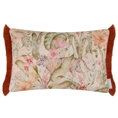 EXQUISITE WATERCOLOUR DESIGN: Hand-painted by in-house artists, the lush tropical scene reveals vibrant foliage and a hidden wild tiger, offering a painterly homage to nature's grandeur. LUXURIOUS PRINTED VELVET: Digitally printed on sumptuously soft velvet, this cushion combines artistic expression with rich texture for a truly indulgent finish. ELEGANT FRINGED TRIM: A refined fringe detail frames the cushion, adding depth and a timeless sense of luxury to your interiors. PRACTICAL ZIP CLOSURE: Designed for beauty and ease, the hidden zip allows for simple care while preserving the cushion’s elegant silhouette. A STATEMENT OF CURATED STYLE: Ideal for those who cherish craftsmanship and design, this cushion effortlessly elevates any space with a bold yet graceful presence.