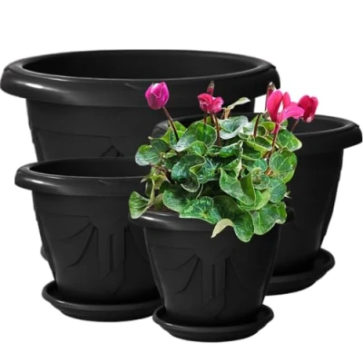 VR7 - Plastic Round Planters 33cm - Black, Set of 2 | Lightweight, Weather Resistant Flower Pots with Tray & Drainage Holes for Outdoor/Indoor Use, Large Decorative Garden Pots Durable & Weather Resistant: Our extra large plant pots are designed to withstand harsh weather conditions, ensuring your outdoor garden pots remain intact and beautiful all year round. Convenient Set of 2: Each pack includes two 33cm planters with Tray and drainage holes, perfect for maintaining healthy plants and enhancing your garden’s aesthetic appeal. Versatile Indoor/Outdoor Use: These stylish black plastic plant pots are perfect for indoor and outdoor settings, offering flexibility and ease of use for any gardening enthusiast. Modern Design for Elegant Spaces: Elevate your garden with these sleek and modern large outdoor plant pots with trays, ideal for adding a touch of sophistication to your green spaces