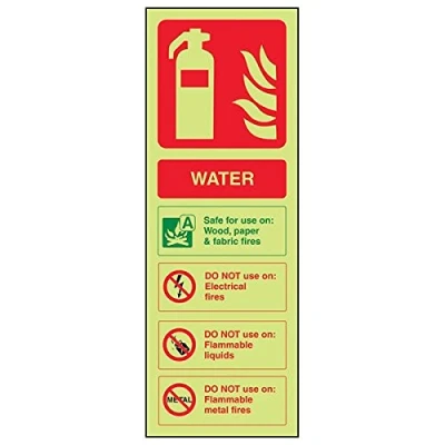 Helps fulfil obligations to convey essential information relating to fire fighting equipment as per Health and Safety (Safety Signs & Signals) Regulations 1996 Conforms to EN ISO 7010:2012 Portrait Orientation. Sign reads "Water. Safe For Use On Wood, Paper & Fabric Fires. DO NOT Use On Electrical Fires. DO NOT Use On Flammable Liquids. DO NOT Use On Flammable Metal Fires" Highly durable Glow In The Dark 1mm plastic material and screen printed message will stand the test of time Sign measures 100 x 280mm.