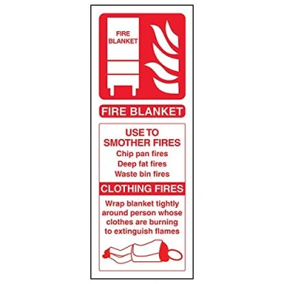 Helps fulfil obligations to convey essential information relating to fire fighting equipment as per Health and Safety (Safety Signs & Signals) Regulations 1996 Conforms to EN ISO 7010:2012 Portrait Orientation. Sign reads "Use To Smother Fires - Chip Pan Fires, Deep Fat Fires, Waste Bin Fires. Clothing Fires - Wrap Blanket Tightly Around Person Whose Clothes Are Burning To Extinguish" Highly durable Self Adhesive Vinyl material and screen printed message will stand the test of time Sign measures 75 x 200mm. Self Adhesive material will adhere securely to most surfaces