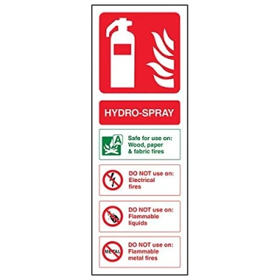 Helps fulfil obligations to convey essential information relating to fire fighting equipment as per Health and Safety (Safety Signs & Signals) Regulations 1996 Conforms to EN ISO 7010:2012 Portrait Orientation. Sign reads "Hydro-Spray. Safe For Use On Wood, Paper & Fabric Fires. DO NOT Use On Electrical Fires. DO NOT Use On Flammable Liquids. DO NOT Use On Flammable Metal Fires" Highly durable 1mm plastic material and screen printed message will stand the test of time Sign measures 100 x 280mm.
