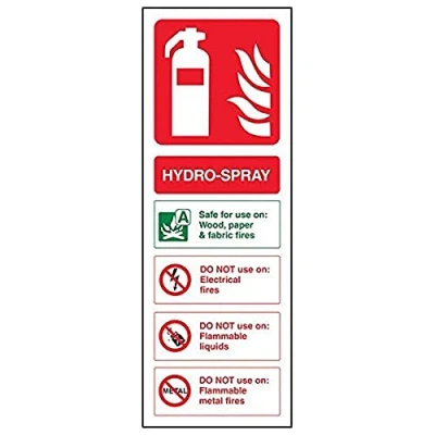 Helps fulfil obligations to convey essential information relating to fire fighting equipment as per Health and Safety (Safety Signs & Signals) Regulations 1996 Conforms to EN ISO 7010:2012 Portrait Orientation. Sign reads "Hydro-Spray. Safe For Use On Wood, Paper & Fabric Fires. DO NOT Use On Electrical Fires. DO NOT Use On Flammable Liquids. DO NOT Use On Flammable Metal Fires" Highly durable Self Adhesive Vinyl material and screen printed message will stand the test of time Sign measures 100 x 280mm. Self Adhesive material will adhere securely to most surfaces