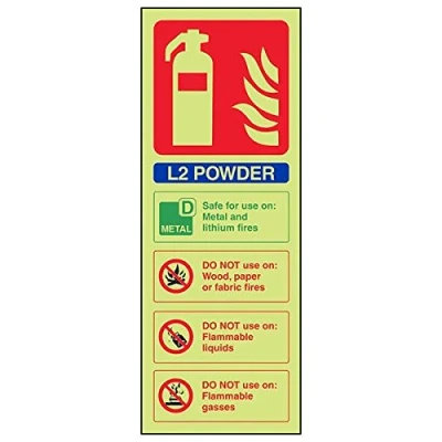 Helps fulfil obligations to convey essential information relating to fire fighting equipment as per Health and Safety (Safety Signs & Signals) Regulations 1996 Conforms to EN ISO 7010:2012 Portrait Orientation. Sign reads "Safe For Use On Metal and Lithium Fires. DO NOT Use On Wood, Paper or Fabric Fires. DO NOT Use on Flammable Liquids. DO NOT Use On Flammable Gases" Highly durable Glow In The Dark 1mm plastic material and screen printed message will stand the test of time Sign measures 75 x 200mm.