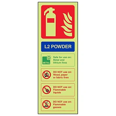 Helps fulfil obligations to convey essential information relating to fire fighting equipment as per Health and Safety (Safety Signs & Signals) Regulations 1996 Conforms to EN ISO 7010:2012 Portrait Orientation. Sign reads "Safe For Use On Metal and Lithium Fires. DO NOT Use On Wood, Paper or Fabric Fires. DO NOT Use on Flammable Liquids. DO NOT Use On Flammable Gases" Highly durable Glow In The Dark 1mm plastic material and screen printed message will stand the test of time Sign measures 100 x 280mm.