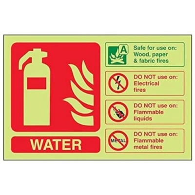 Helps fulfil obligations to convey essential information relating to fire fighting equipment as per Health and Safety (Safety Signs & Signals) Regulations 1996 Conforms to EN ISO 7010:2012 Landscape Orientation. Sign reads "Water. Safe For Use On Wood, Paper & Fabric Fires. DO NOT Use On Electrical Fires. DO NOT Use On Flammable Liquids. DO NOT Use On Flammable Metal Fires" Highly durable Glow In The Dark 1mm plastic material and screen printed message will stand the test of time Sign measures 150 x 100mm.