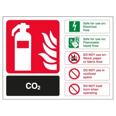 Helps fulfil obligations to convey essential information relating to fire fighting equipment as per Health and Safety (Safety Signs & Signals) Regulations 1996 Conforms to EN ISO 7010:2012 Landscape Orientation. Sign reads "CO2. Safe For Use On Flammable Liquid Fires. Safe For Use On Electrical Fires. DO NOT Use On Wood, Paper or Fabric Fires. DO NOT Use In Confined Space." Highly durable Self Adhesive Vinyl material and screen printed message will stand the test of time Sign measures 200 x 150mm. Self Adhesive material will adhere securely to most surfaces