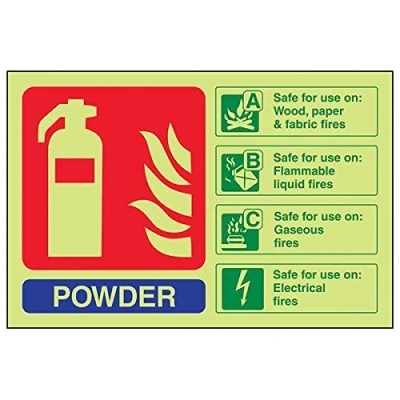 Helps fulfil obligations to convey essential information relating to fire fighting equipment as per Health and Safety (Safety Signs & Signals) Regulations 1996 Conforms to EN ISO 7010:2012 Landscape Orientation. Sign reads "Powder. Safe For Use On Wood, Paper & Fabric Fires. Safe For Use On Flammable Liquid Fires. Safe For Use On Gaseous Fires. Safe For Use On Electrical Fires" Highly durable Glow In The Dark 1mm plastic material and screen printed message will stand the test of time Sign measures 150 x 100mm.