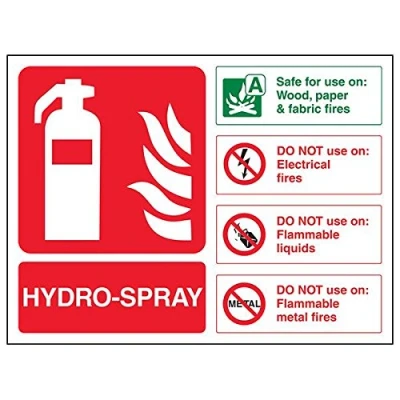 Helps fulfil obligations to convey essential information relating to fire fighting equipment as per Health and Safety (Safety Signs & Signals) Regulations 1996 Conforms to EN ISO 7010:2012 Landscape Orientation. Sign reads "Hydro-Spray. Safe For Use On Wood, Paper & Fabric Fires. DO NOT Use On Electrical Fires. DO NOT Use On Flammable Liquids. DO NOT Use On Flammable Metal Fires" Highly durable 1mm plastic material and screen printed message will stand the test of time Sign measures 200 x 150mm.