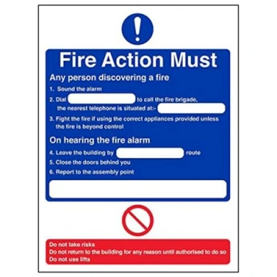 Provides essential information regarding action to be taken in the event of a fire Conforms to EN ISO 7010:2012 Portrait Orientation. Sign reads "Fire Action. Any Person Discovering A Fire." Highly durable Self Adhesive Vinyl material and screen printed message will stand the test of time Sign measures 150 x 200mm. Self Adhesive material will adhere securely to most surfaces