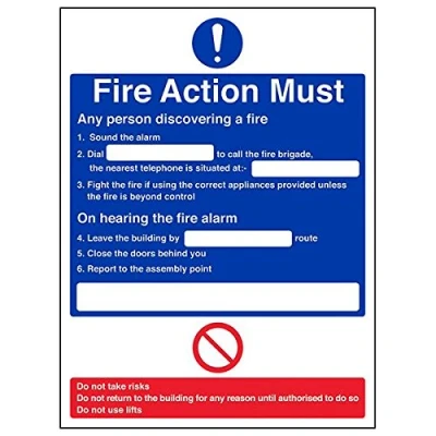 Provides essential information regarding action to be taken in the event of a fire Conforms to EN ISO 7010:2012 Portrait Orientation. Sign reads "Fire Action. Any Person Discovering A Fire." Highly durable Self Adhesive Vinyl material and screen printed message will stand the test of time Sign measures 300 x 400mm. Self Adhesive material will adhere securely to most surfaces